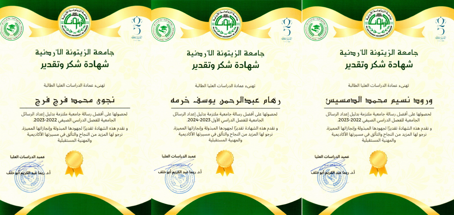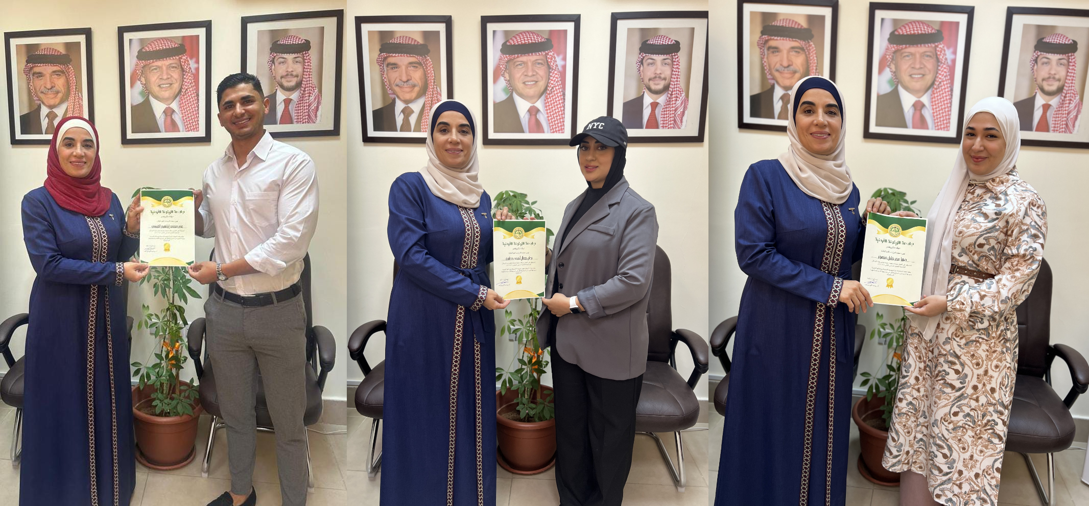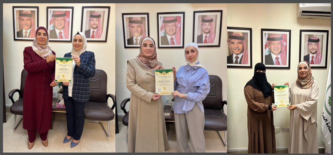 Riham Abdulrahman Yousef Khurma — Master’s in Pharmaceutical Sciences, Faculty of Pharmacy. Najwa Mohammad Faraj Faraj — Master’s in Accounting, Faculty of Business. Woroud Naseem Mohammad Al-Damsis — Master’s in Law, Faculty of Law.