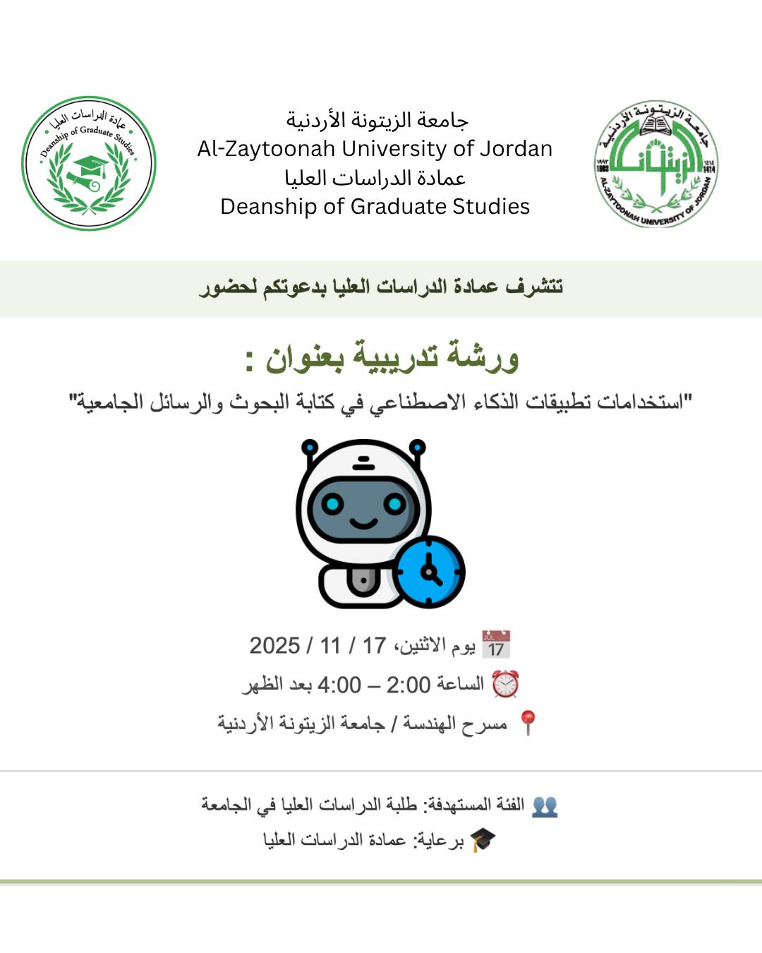 The Deanship of Graduate Studies at Al-Zaytoonah University of Jordan organized a training workshop on Monday, November 17, 2025, titled: