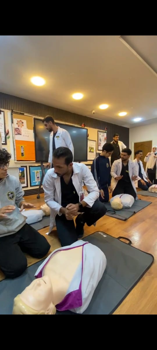 Based on the role of the Faculty of Nursing at Al-Zaytoonah University of Jordan in promoting community health and disseminating essential medical knowledge, a community training activity entitled "Hands-Only CPR" was conducted on Wednesday, November 5, 2025, from 10:00 AM to 1:20 PM, in cooperation with Marshall International School - Deir Ghbar. This activity coincided with World CPR Day, launched annually by the American Heart Association (AHA), with the aim of promoting a culture of rapid intervention and empowering the community to take life-saving steps in emergency situations. Target Audience: Parents, students, and administrative and teaching staff at Marshall International School. Details of the Training: The training included an explanation of the basic concepts of Hands-Only CPR, the correct response steps in case of cardiac arrest, how to assess a casualty and call for emergency services, in addition to hands-on practical training on training mannequins to enable participants to perform chest compressions according to established standards. Activity Objectives: To raise community awareness of the importance of cardiopulmonary resuscitation (CPR). To enable participants to apply practical life-saving skills. To enhance the role of the College of Nursing in community service. To support the American Heart Association's (AHA) first aid guidelines. Outcomes and Results: Participants were able to practically apply Hands-Only CPR skills. The training raised awareness of the importance of rapid intervention in cardiac arrest cases. It strengthened cooperation between the College of Nursing and Marshall International School. Participants expressed strong interest in repeating such training sessions. Future Recommendations: Continue to conduct such activities regularly. Expand the scope of the training to include other schools and organizations. Prepare supporting educational materials such as brochures and short instructional videos.